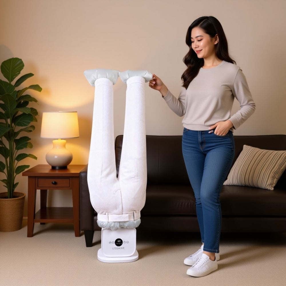 The balloon-like body gently inflates with warm air. Simply place a damp shirt or pair of trousers over it, secure the clips, and set your preferred time and temperature. As it inflates, the warm air dries and smooths the fabric, leaving it crisp and ready to wear.